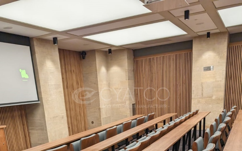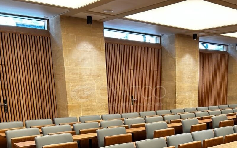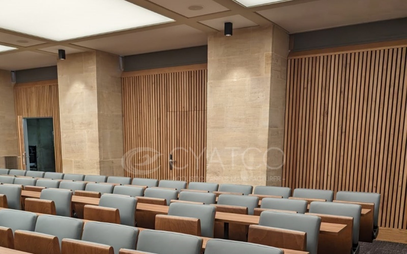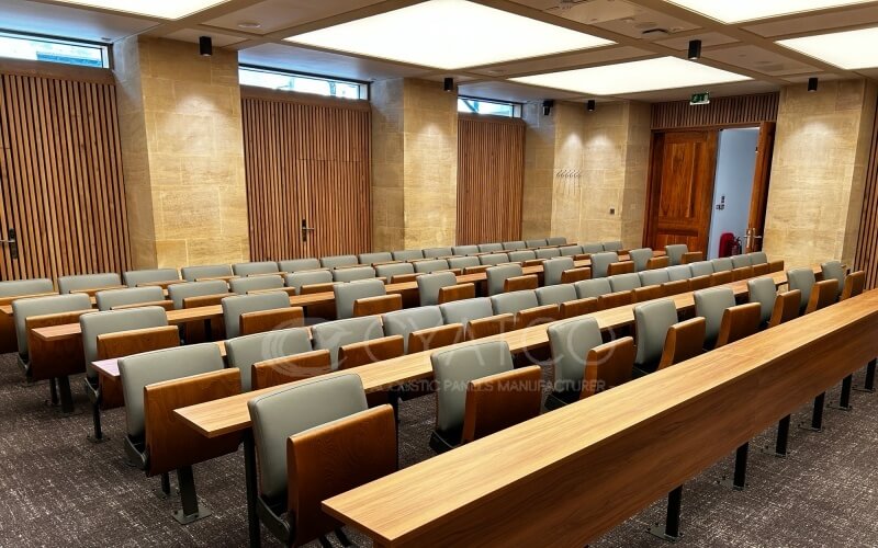 The classrooms of this university previously experienced significant echo issues, and external noise occasionally interfered, adversely affecting the quality of teaching. In this renovation project, the walls were identified as critical areas for treatment, leading to the installation of wood slat panels. These acoustic panels exhibit exceptional sound absorption performance in mid and high frequencies, effectively reducing sound reflection and lowering reverberation time, thereby enhancing the clarity of the teacher’s voice during lectures.