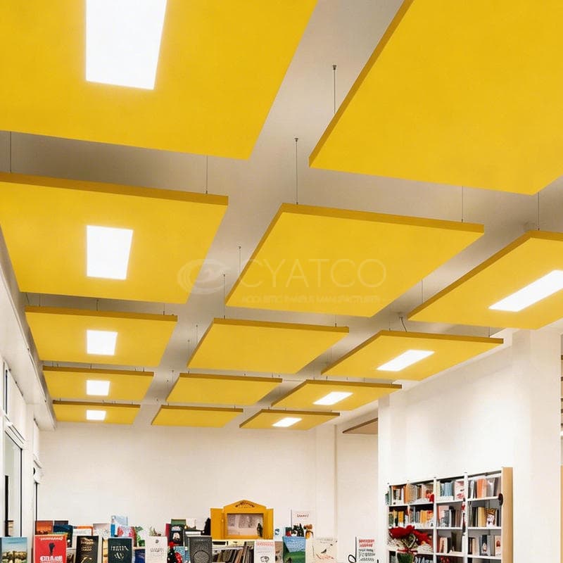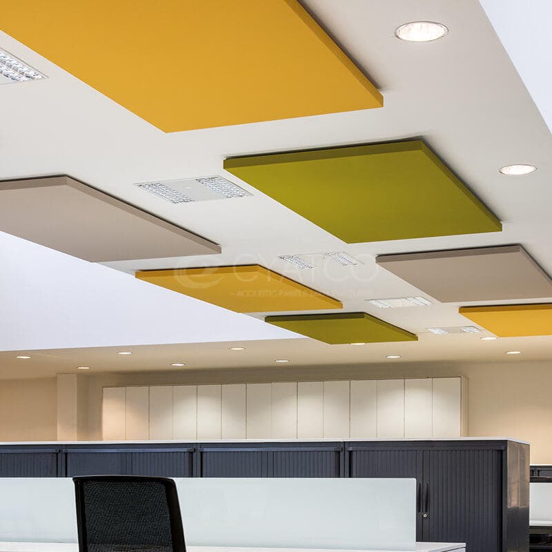 Fabric-wrapped square acoustic panels are manufactured with a frame, internal sound-absorbing material, and a fabric finish, offering a combination of sound absorption, noise reduction, and decorative appeal.